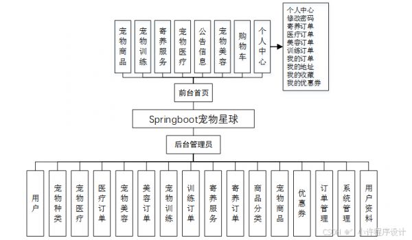 宠物星球的建设可以为管理提供帮助,通过对一些基础信息管理实现针对性的安排,可以按照用户的角色权限使不同用户角色看到不一样的信息界面。现根据需求阶段的分析,我们可以大致确定系统需要包含的功能如下图所示: