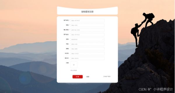 在注册流程中,用户在Vue前端填写必要信息(如用户名、密码等)并提交。前端将这些信息通过HTTP请求发送到Java后端。后端处理这些信息,检查用户名是否唯一,并将新用户数据存入MySQL数据库。完成后,后端向前端发送注册成功的确认,前端随后通知用户完成注册。这个过程实现了新用户的数据收集、验证和存储。注册页面如图5-2所示: