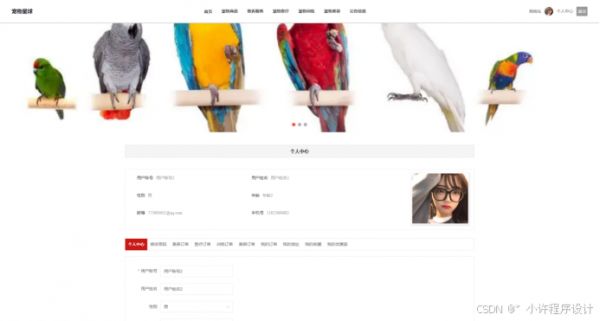在个人中心页面输入个人信息可以进行更新操作,并在个人中心、修改密码、寄养订单、医疗订单、训练订单、美容订单、我的订单、我的地址、我的收藏、我的优惠券进行详细操作;如图5-5所示: