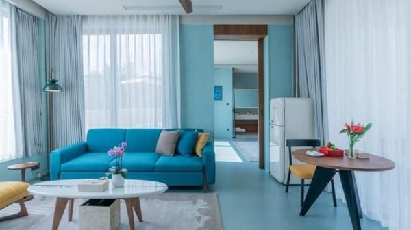 在住宿板块,为满足冲浪爱好者和度假客群的多元住宿需求,中旅逐浪度假区项目推出两大特色酒店--樾潮冲浪主题酒店与屿玥设计师酒店,围绕 "礁石"和"海浪" 等万宁本地自然元素,精心设计出132间风格独特的客房,打造"栖浪而眠"的特色住宿体验。