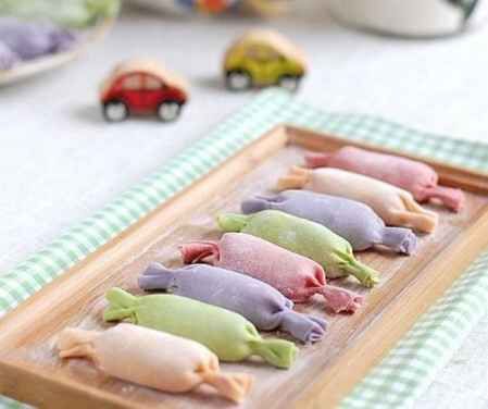 5、切好的饺子皮,放上馅,左右和下面一边都沾上水。叠起成长方形。两头稍捏就成了**的糖果饺了。