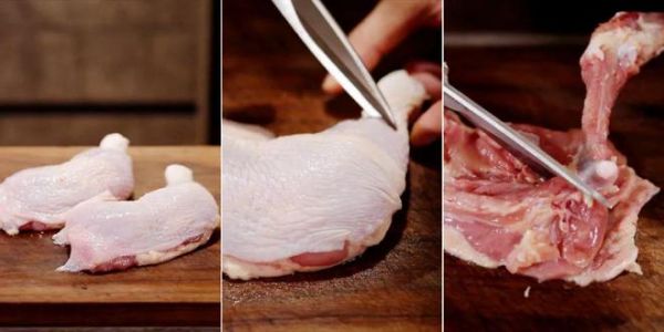 将鸡腿先去骨。从腿骨的上方这个位置(上图中)剪开,再沿着腿骨将肉剪下来,把骨头拿掉,鸡腿肉就准备好了。