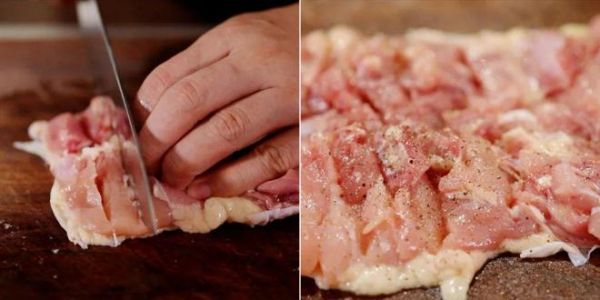 在鸡腿肉上用刀尖扎几下,使鸡腿肉更容易入味。再像上图左边这样切几刀,这样可以防止煎的时候鸡肉回缩。但千万小心不要把鸡皮切断了。