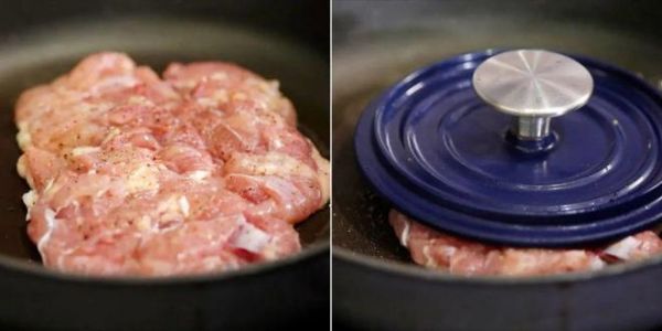 锅烧热倒入一点点植物油。将鸡腿肉放入锅里,皮的一面朝下。用一个重物将鸡肉压住,这样煎的时候能更好的保持形状,没有的话就算了哈。