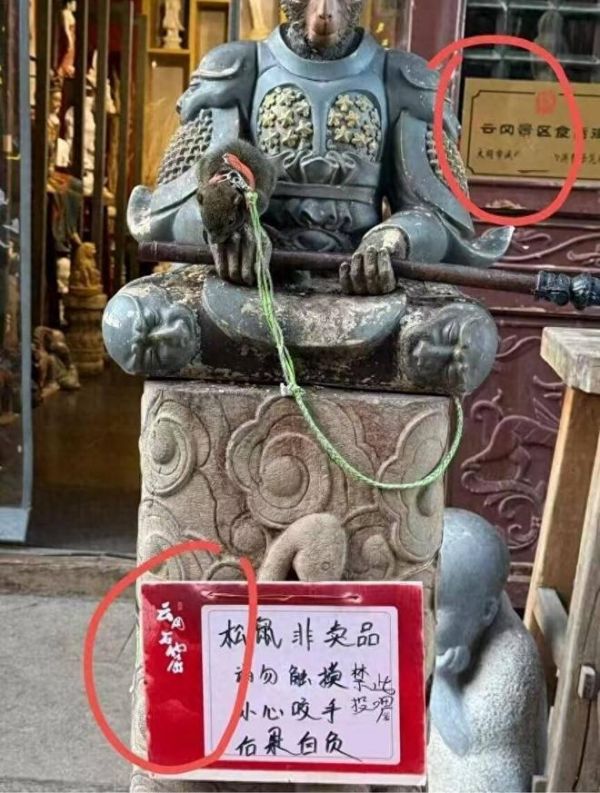 扬子晚报网10月29日讯(记者 郭一鹏 实习生 孙舒颜) 10月28日,山西大同。有网友在社交平台发帖称,云冈石窟美食商业街一家店铺把松鼠拴在门口的黑猴雕像上,疑似用来招揽客人,并质疑其存在“虐待动物”的行为。