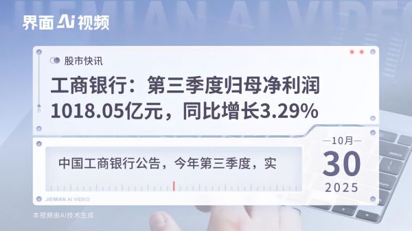工商银行:第三季度归母净利润1018.05亿元,同比增长3.29%