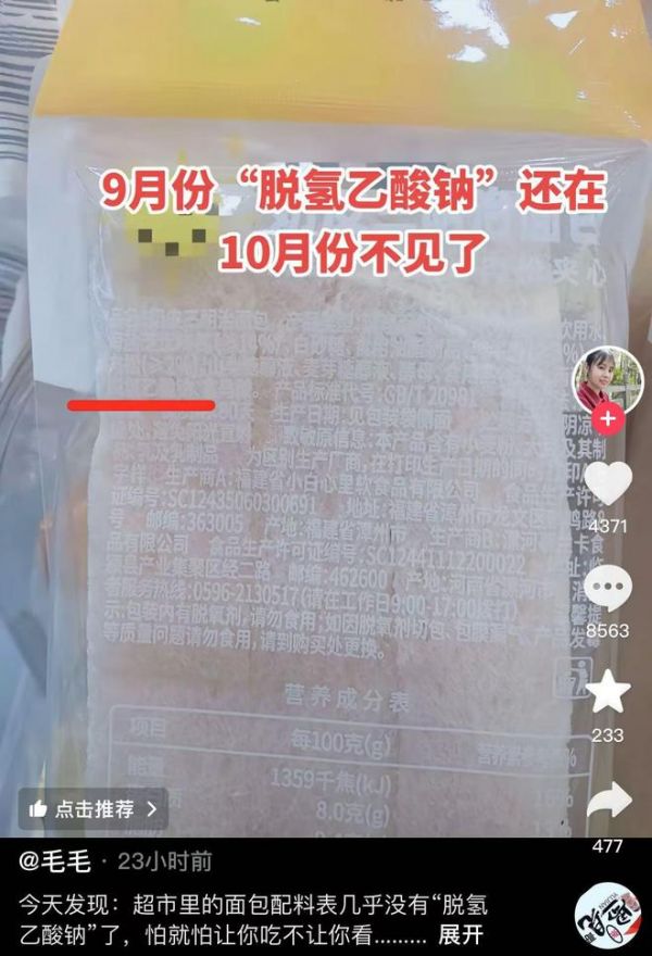 这不有网友就分享了这件事情,表示她发现超市里的面包配料表几乎都没有“脱氢乙酸钠”了。而在评论区里,就不少网友又开始议论起面包加添加剂一事。当然也没有办法,面包这个东西想要好吃就得添加不少的添加剂。而为了能延长保质期,所以面包里肯定会有防腐剂的。如果真的想吃健康的面包,那还是只能去面包店吃刚出炉的。当然你也无法保证,现烤出来的面包就一定没有添加剂。毕竟如今很多蛋糕上的奶油,也会加一些添加剂来让其变得更好吃。