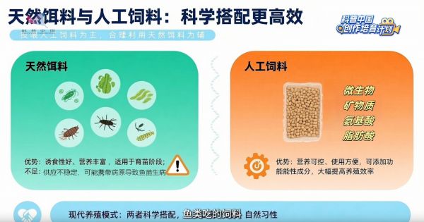 天然饵料诱食性好、营养丰富,通常在育苗阶段使用,但供应不稳定,可能携带病原,造成鱼苗死亡。人工饲料营养可控、使用方便,可添加功能性成分,大幅提高养殖效率。现代养殖以 “投喂人工饲料为主,合理利用天然饵料为辅” 的养殖模式,兼顾营养与鱼类自然习性。