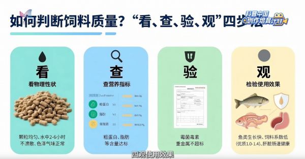 检验饲料质量:一看物理性状:颗粒均匀,水中 2-6 小时不溃散,色泽气味正常;二查营养指标:粗蛋白、粗脂肪含量达标;三验卫生标准:霉菌毒素、重金属不超标;四观使用效果:鱼类生长快,饲料系数低,优质饲料通常在 1.0-1.4,肝脏肠道健康。