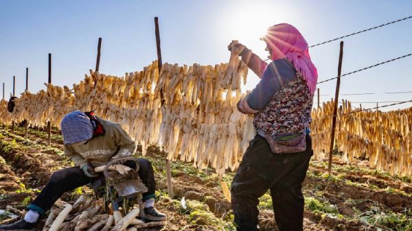 10月29日,农民在宁夏吴忠市红寺堡区红寺堡镇弘德村晾晒萝卜条(无人机照片)。眼下正值宁夏吴忠市红寺堡区的1.52万亩萝卜收获季,田间地头一片繁忙景象。眼下正值宁夏吴忠市红寺堡区的1.52万亩萝卜收获季,田间地头一片繁忙景象。