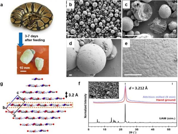 近日,在一项发表于国际权威化学期刊《美国化学会杂志》的研究中,研究人员检测了球蟒、安哥拉蟒等20多种爬行动物的固态尿液,结果发现:所有样本中都含有由尿酸构成的微小球体。