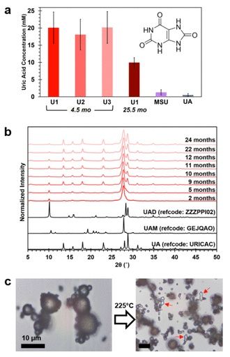 随后的X射线分析,进一步揭开了这些微球的内部结构:它们其实是由更小的尿酸-水合物纳米晶体构成。