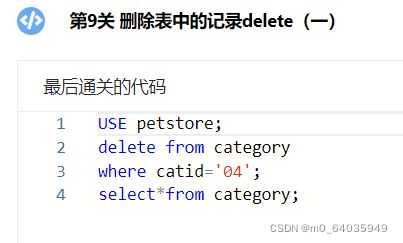本关任务:删除宠物商店数据库(PetStore)的商品类别(category)表catid=‘04’的记录,并查询删除记录后的表。