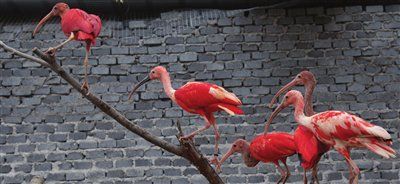 记者在场外隔着金属护栏看到,46只美洲红鹮灿若红霞,真不愧为“全世界最红的鸟”。它们或聚集在场地一边,或栖息在木架上,样子十分悠闲。看得出来,它们的身体状况都非常不错。但当记者打开铁门,准备进入场地时,它们开始警觉起来,纷纷逃向了场地旁边的屋子里。