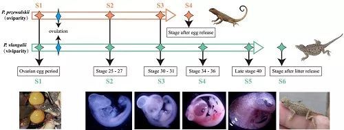 图1. 荒漠沙蜥(卵生)和青海沙蜥(胎生)主要繁殖时期对比以及该研究中转录组样品收集时期表