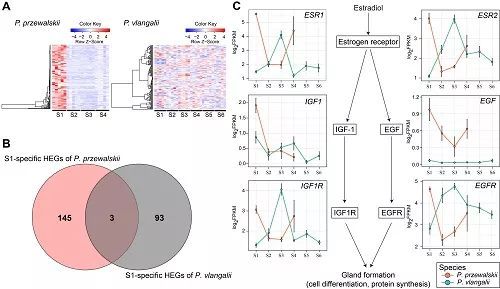 在卵壳退化方面,研究发现在荒漠沙蜥(卵生)卵壳腺形成时期(卵黄生成期,S1期),与输卵管/子宫上皮分化、腺体发育等相关功能的基因呈现特异性高表达,而这些基因在青海沙蜥(胎生)的相应时期并没有呈现相同的趋势。如雌激素受体(ESR)介导的生长因子通路,此前报道与卵壳腺形成相关,且该通路中的部分基因在荒漠沙蜥S1期特异高表达,而在青海沙蜥中则呈现相反的表达模式。该结果表明,卵壳腺的退化可能是导致青海沙蜥卵壳退化的关键因素。