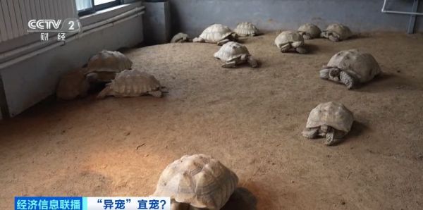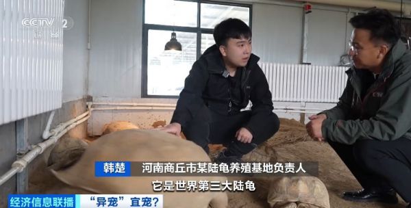 在河南商丘市,记者来到一个陆龟饲养基地,看到几十只产自世界各地的陆龟,正在暖房里栖息、觅食。韩楚是这家陆龟饲养基地的负责人,平常就很喜欢“异宠”的他看到了商机,和家人一起饲养起了陆龟。