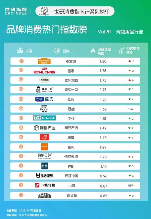 宠物用品品牌TOP15,精细化健康需求攀升|世研消费指数品牌榜Vol.55