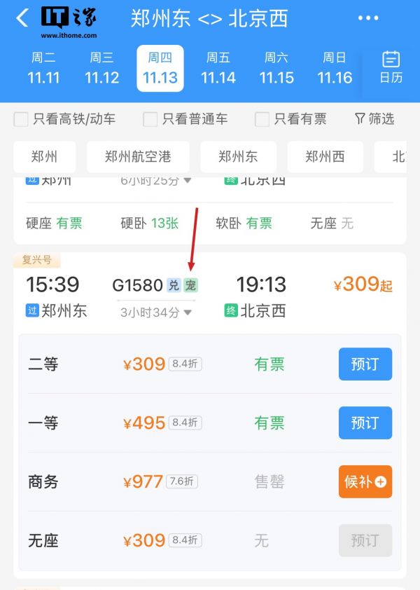 IT之家 11 月 2 日消息,据央视新闻报道,铁路 12306 App 的官方购票页面目前已上线“宠物托运”功能,用户可以直观发现部分列车车次信息旁已有“宠”字标识,这代表相应车次可办理宠物托运业务(IT之家注:目前全国有 40 座高铁站可办理)。