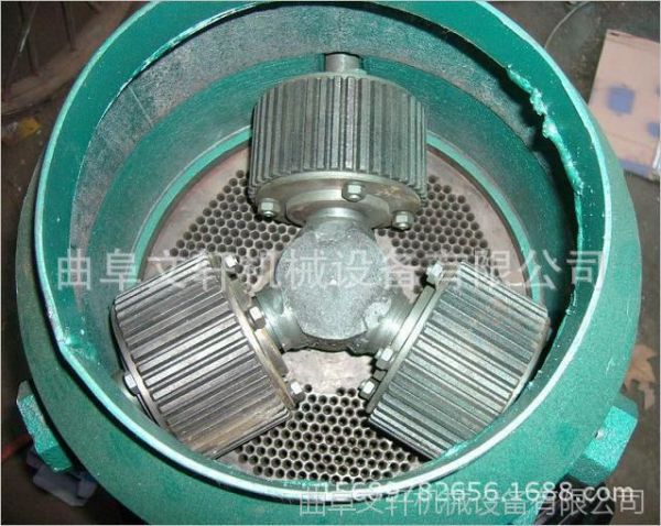 3.颗粒机压轮和磨盘间的空隙过大,也可能是导致颗粒机不出料的原因之一,调节压轮和磨盘间隙的方法,单手拧住压轮,调节对应的螺栓,调整到两边的压轮用力晃不动,稍微有点紧的状态下,那就是说明压轮和磨盘已经调节到位了。