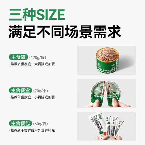 接下来要介绍的是帕特全价主食猫罐头,专为各个成长阶段的猫咪设计。这款罐头采用了生骨肉配方,模拟了猫咪自然的猎食习惯,让它们在家中也能享受到猎物的真实味道。每盒罐头一掰变身35g,完美满足小胃猫的需求,少食多餐的理念能有效控制猫咪的体重。