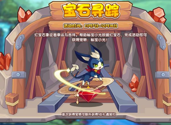 红宝石象征着幸运与吉祥。帮助秘宝小光挖掘红宝石,完成活动即可获得宠物:秘宝小光!