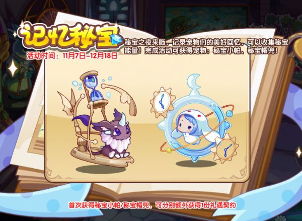 秘宝之夜来临,记录宠物们的美好回忆,可以收集秘宝能量!完成活动可获得宠物:秘宝小帕、秘宝帽兜!