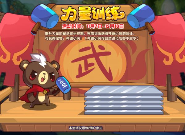提升力量的秘诀在于控制,完成训练获得神锤小侠的信任,可获得宠物:神锤小侠!(神锤小侠可自然进化成妙尔尼尔)本活动仅限VIP用户参与。