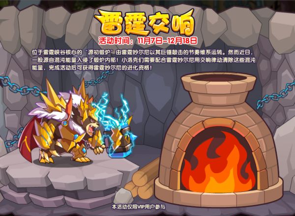 位于雷霆峡谷核心的“源初锻炉”由雷霆妙尔尼以其巨锤敲击的节奏维系运转。然而近日,一股源自混沌的能量入侵了锻炉内部!小洛克们需要配合雷霆妙尔尼用交响律动清除这些混沌能量,完成活动后可获得雷霆妙尔尼的进化资格!本活动仅限VIP用户参与。