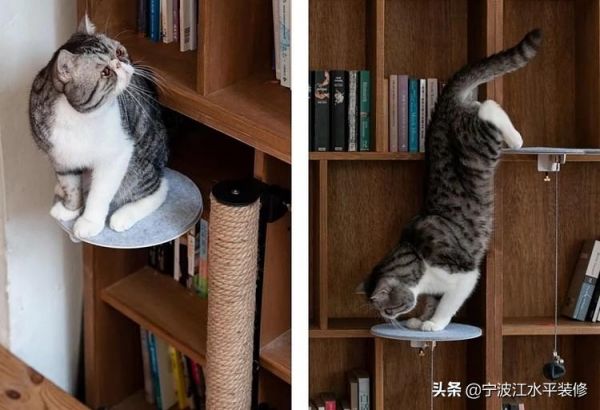 有一些大型猫爬架结合了一部分的储物功能,也具备逗猫、磨爪和宠物沙发的功能,只是价格不菲。如果不愿直接购买成品,宠物主人也可以自行将自家的墙壁改造为猫爬架,储物的墙搁架可以整条使用也可以锯开作为小跳台,缠绕剑麻绳并且用热熔胶固定就可以当做磨爪板,只是固定这类自制墙架时需要电钻和膨胀螺丝,毕竟成年猫的体重并非无痕钉或是胶贴纸可以承担。