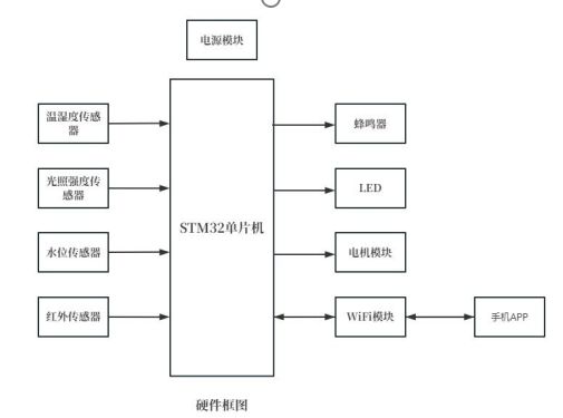 本智能宠物仓系统的主控采用stm32f103系列单片机;采用温湿度传感器监测宠物生长环境的温湿度;采用光照强度传感器检测环境的光照亮度;水位传感器监测水位值,红外传感器监测有无食物,光照过低自动打开led补光;饲喂采用直流电机控制,补水采用水泵电机;通过esp8266wifi模块将硬件部分接入互联网,在阿里云端搭建云平台,可以展示温湿度、光照强度,根据监测的水位过低或者没有食物,app端可以下发指令控制喂食和补水电机动作。