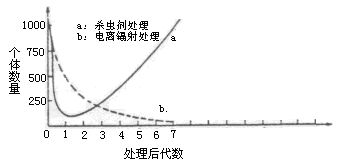 27.螺旋蛆蝇是家畜的毁灭性寄生虫。在实验室里对两组数量相同的螺旋蛆进行不同的处理:一组使用杀虫剂;另一组使用电离辐射促使其雄性不育,实验结果如下图所示。请据图回答下列问题: