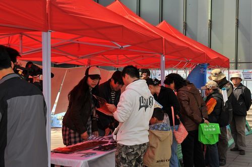 启动仪式还举行了“关爱地球,保护鸟类,从我做起”集体签名活动。到场的嘉宾和观众纷纷在背景板上签名,整个仪式气氛热烈,规模宏大,内容丰富(图六)。启动仪式后,来宾和观众们参观了为配合此次爱鸟周活动特别推出的摄影展《飞羽瞬间——第二届中国国家地理“飞羽瞬间”野生鸟类摄影作品展》和《北京动物园翠鸟摄影作品展》,展出的百余幅摄影作品为广泛的受众普及了爱鸟的知识。博物馆门口设立的科普展棚成为广场上一道独特的风景线,展示内容涉及鸟类知识的方方面面,吸引不少游客驻足观看(图七)。