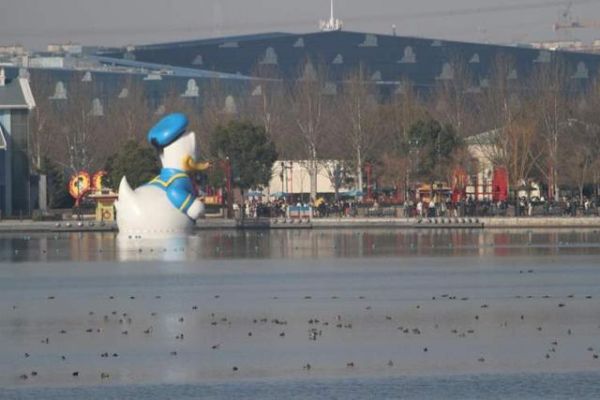 星愿公园的野鸭和巨萌唐老鸭相映成趣。