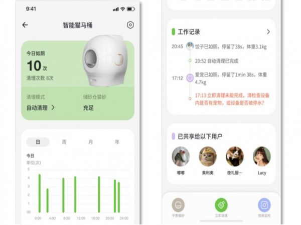 多维度数据记录:实时记录猫咪如厕动态,生成日、周、月、年数据汇总,通过宠咕咕APP端直观展示给猫主;并可搭配专属宠咕咕(petgugu)识别项圈,实现多宠家庭精细化AI监测,可记录宠物体重变化与如厕数据变化,并生成周报分析,帮助用户从日常指标中提前察觉宠物身体异常,助力早期疾病预防;