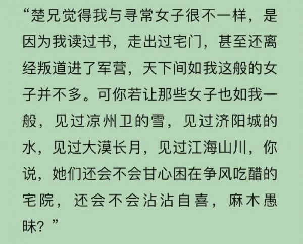 此外,《锦月如歌》原著《重生之女将星》中关于闺阁女子的台词,也被拿出来与《朝雪录》中提及闺阁女子的台词比较。