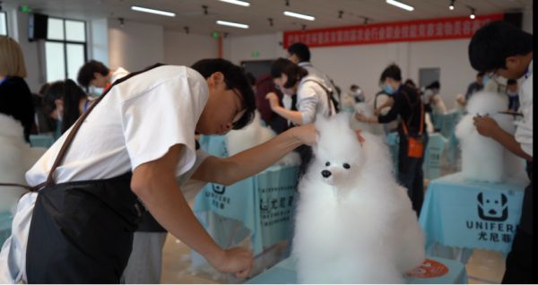 在宠物美容实操比赛现场,参赛选手神情专注,手中剪刀不停翻转,不一会儿,一只只模型宠物狗就被打理得乖巧可爱。