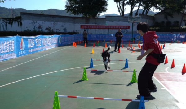 在宠物驯导师比赛场地,记者看到狗狗们在参赛选手的口令下,依次越过障碍,跳远、蹲坐或卧倒,动作一气呵成,配合默契。