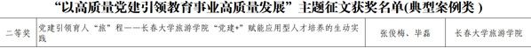 近日,由教育部高校思想政治工作创新发展中心主办的2025年度“以高质量党建引领教育事业高质量发展”主题征文活动结果正式揭晓,我校申报的典型案例《党建引领育人“旅”程——长春大学旅游学院“党建+”赋能应用型人才培养的生动实践》,历经多轮严格评选,最终荣获典型案例类二等奖,实现了学校党建工作综合类成果新突破,标志着学校长期以来,坚持以高质量党建引领高质量发展的经验作法得到了更高水平的认可。