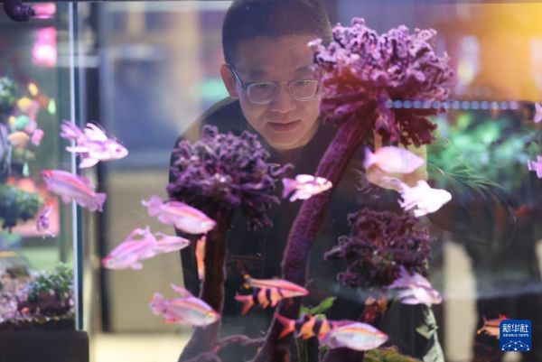 4月10日,在鞍山三台子观赏鱼交易中心,一名商户展示自家售卖的观赏鱼。