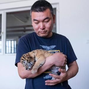 已在东北虎林园工作近20年的东北虎饲养员李鑫专门负责照顾刚出生不久的虎宝宝,给小虎称重、测体温、喂食。他把小老虎当成孩子一样照顾。