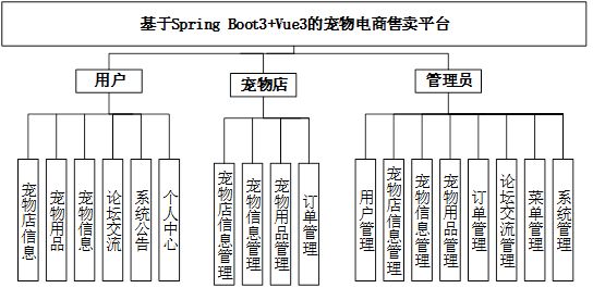 基于Spring Boot3+Vue3的宠物电商售卖平台共分为三个部分,一部分是面向用户的部分,包括:用户的注册登录,查看个人或者修改个人信息,查看宠物店信息,宠物用品,宠物信息,论坛交流,系统公告,个人中心等功能。一部分是宠物店的后台管理部分,包括宠物店信息管理,宠物信息管理,宠物用品管理,订单管理等功能。另一部分是系统的后台管理部分,包括对用户账号的新增、删除、修改等操作,以及查看个人信息,进行宠物店信息管理,宠物信息管理,宠物用品管理,订单管理,论坛交流管理,系统管理,菜单管理等功能。系统结构功能图如下图4-1所示。