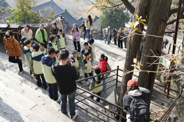 师生开启文化寻芳之旅。连云港师范学院的同学们激情诵读描写银杏的历代佳作,叮叮书房的竹子老师围绕千年银杏树,深入浅出地讲解银杏树与银杏叶的奥秘,带领大家读懂银杏的“自然智慧”。同时通过共读绘本《一片叶子落下来》,让孩子们在温馨互动中领悟生命的温暖与力量。活动的后半段,连云港导游协会的张红艳老师化身“文化向导”,带领大家探访了三元宫、大圣殿与水帘洞,全方位呈现花果山的千年文脉与西游魅力。