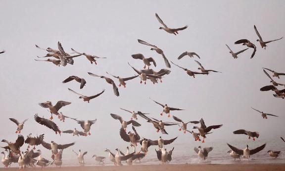鸿雁是亚欧大陆鸭科的一种常见鸟类。是典型的候鸟。在繁殖季节,它们大量出现在我国东北地区。福建、广东等沿海地区迁徙越冬,尤其是我国第二大湖泊鄱阳湖,每年约有5万只鸿雁在这里越冬。