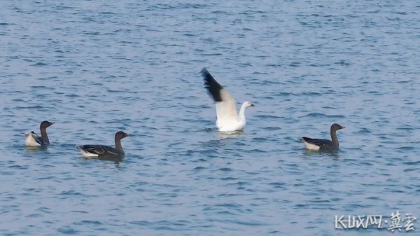 通体白色的雪雁首次现身衡水湖。李明 摄