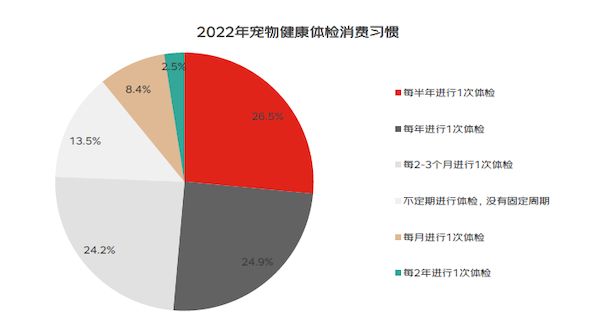 据《中国宠物健康消费白皮书》显示,随着宠物主养宠健康意识的提升,越来越多的宠物主会定期带宠物进行健康体检,26.5%的宠物主选择每半年1次给宠物进行体检;24.9%的宠物主选择每年一次进行体检;24.2%的宠物主选择每2-3个月进行1次体检;此外,还有13.5%的宠物主表示带宠物体检没有固定周期,会不定期进行体检。