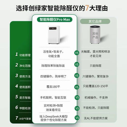创绿家智能除醛仪ProMax通过深度学习模型,实现实时空气质量监测,智能净化。同时,它采用无耗材设计,环保又省心,适合新房装修后使用。