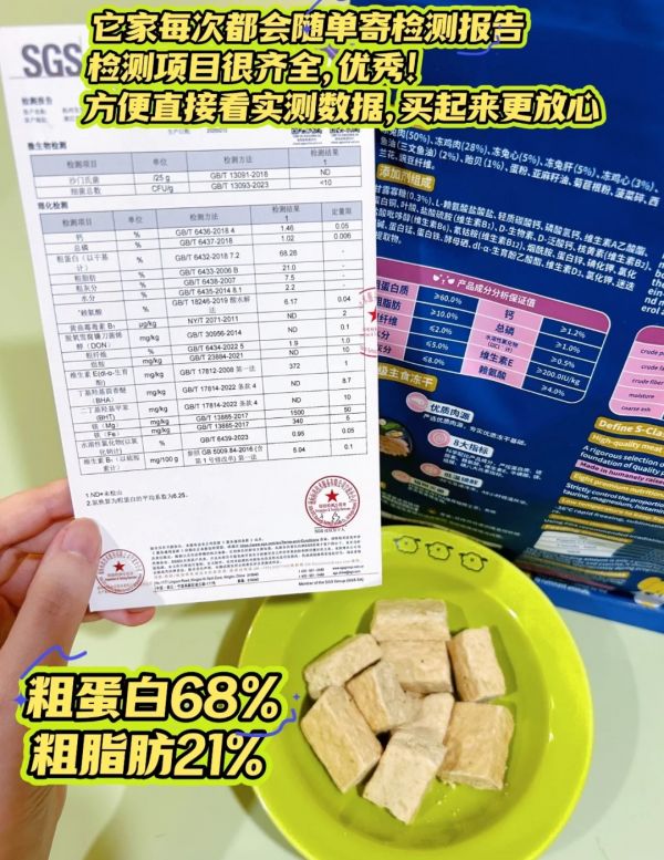 他家三大营养素比例是高蛋白、低碳水、中低脂肪的,我收到的这批兔肉口味的粗蛋白68%,蛋白质来源是优质动物蛋白,兔肉占比50%,赖氨酸实测值6.17%,没有靠植物蛋白来拉高蛋白质比例