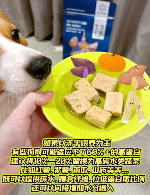 如果以冻干喂养为主,有些狗狗可能适应不了60%+的高蛋白,建议将10%~20%替换为高碳水类蔬菜,比如红薯、南瓜,既可以提供碳水、膳食纤维,拉低蛋白质比例,还可以间接增加水分摄入
