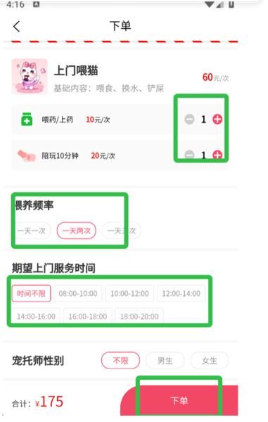 4、选择需要的附加服务、喂养评率、以及期望上门时间,若对宠妥师性别有要求,还可选择性别,然后点击【下进行付款单】即可。